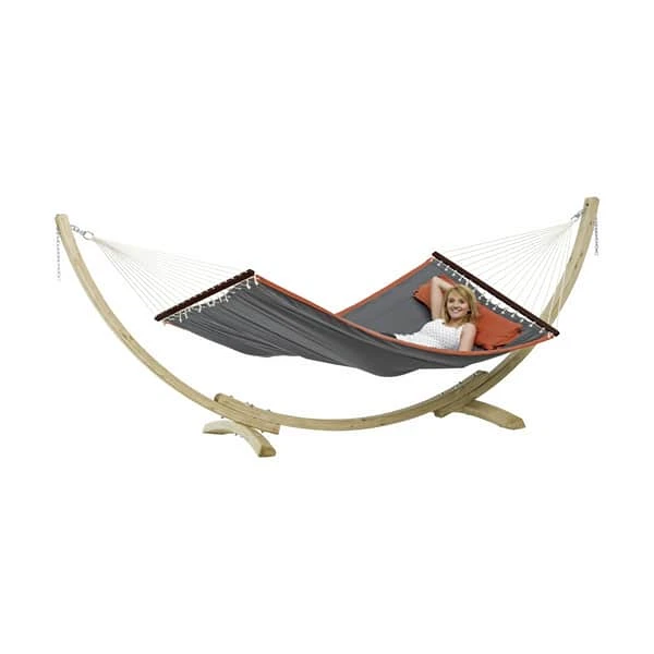 Trendy luksushængekøjesæt fra Amazonas. Sættet består af en stor vatteret American Dream hængekøje i tæt vævet stof og med aftagelige hynder, og en vejrbestandig Apollo træstander i trykimprægneret fyrretræ. Hængekøjen og standeren er bundet sammen med adskillige tykke ophængssnore, der sikrer en jævn vægtfordeling og følelsen af vægtløshed.