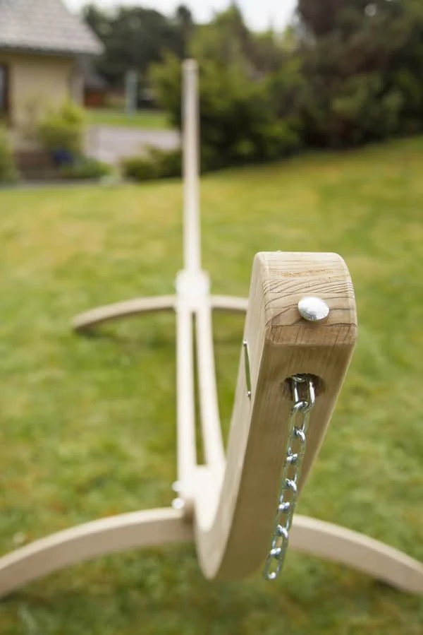Flot og robust træstander til hængekøjer fra Amazonas. Standeren er fremstillet i FSC-certificeret, flerlags vejrbestandigt fyrretræ fra europæiske skove. Selve trælagene er limet i hånden, hvilket giver ekstrem stabilitet og sikkerhed. Beslag og skruer er i rustfrit galvaniseret stål. Kædeophænget er justerbart, så standeren passer forskellige hængekøjestørrelser.