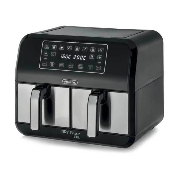 Med denne airfryer fra Ariete får du to kurve, som hver især kan varme med forskellige temperaturer. De kan rumme 4 liter hver, så med den hurtige luftcirkulation og et forbrug på 80% mindre fedt end traditionelle frituregryder, er det en ideel måde at tilberede dine måltider. Kurvene er belagt med non-stick materiale, der gør dem utrolig nemme at rengøre efter brug.