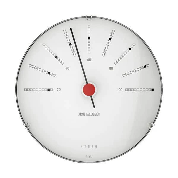 Arne Jacobsens kendte Bankers ur er inspirationen bag Arne Jacobsen Bankers hygrometer. Med hygrometeret kan du holde øje med luftfugtigheden i dit hjem, og samtidig have glæde af det minimalistiske og funktionalistiske design, som er et kendetegn for Arne Jacobsen. Med både Bankers vægur, hygrometer, barometer og termometer kan du skabe en komplet vejrstation, hvor du altid har helt styr på dine omgivelser. Diameter: 12 cm.