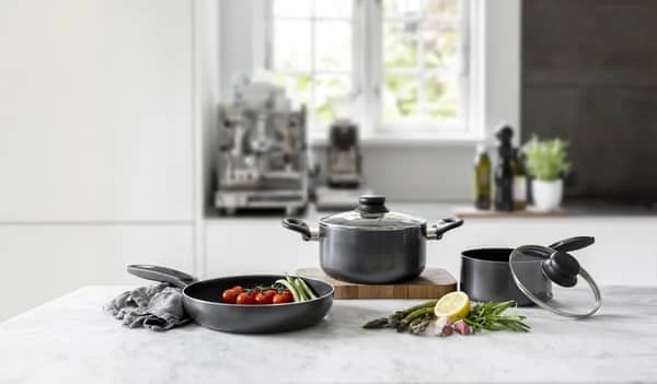 Alle tre dele har Super-slip Sølv non-stick belægning. Det betyder, at både gryderne og panden har rigtig gode stegeegenskaber og er nemme at gøre rene.