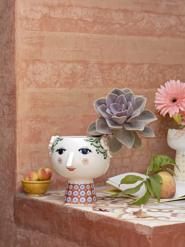 Giv dine planter et kreativt udtryk med Eva urtepotteskjuleren på rød fod fra Bjørn Wiinblad. Urtepotteskjuleren er fortolket som Eva på fod med fine dekorationer, og vil give dig finurlige og eventyrlige detaljer. Den har god plads til eksempelvis krydderurter, en kaktus eller farverige buketter. Urtepotteskjuleren på fod er et attraktivt samleobjekt, hvor du kan understrege 1970’ernes nostalgi og samtidig være yderst moderne inden for nutidens boligindretning.