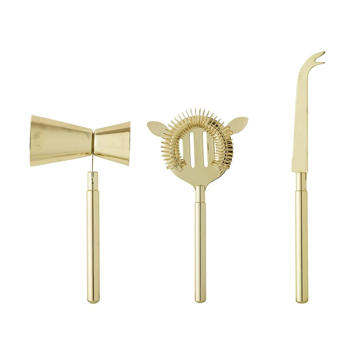 Cocktail barsættet fra Bloomingville er lavet i rustfrit stål, er guldfarvet og består af 3 dele – en måleske, en stirrer og en kniv.