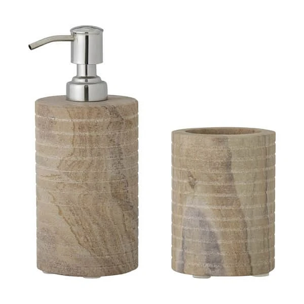 Ciro sæbedispensersættet fra Bloomingville er lavet af rustfrit stål og sandsten i lyse farver. Den har et nordisk og eksklusivt look, og vil helt sikkert pynte perfekt på dit badeværelse.
