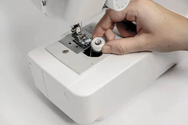 Her indsættes undertrådsspolen, så den ligger vandret i maskinen. Det gør trådningen lettere, da overtråden nemt henter undertråden. Den gennemsigtige plade tillader dig at følge med i processen, men også om spolen sidder korrekt og om spolen er ved at løbe tør for tråd.