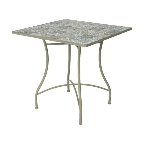 Det fine cafébord er beklædt med mønstrede fliser i farven taupe. Selve stellet er fremstillet i hårdført jern, hvilket gør det særdeles oplagt til din have eller altan, da den kan tåle vind og vejr.