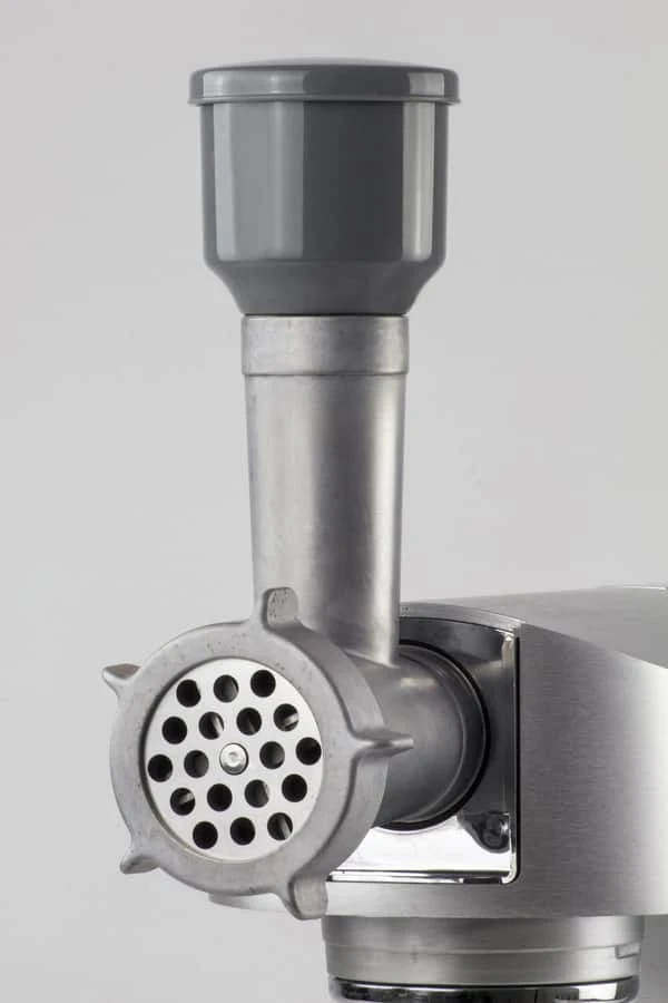 Kødhakker der passer til Caso KM 1200 Chef køkkenmaskine. Med kødhakkeren får du 3 forskellige hulskiver (grov, medium og fin). Brug kødhakkeren til fremstilling af fx pølser eller bagværk. Nedskubber og bakke følger også med.