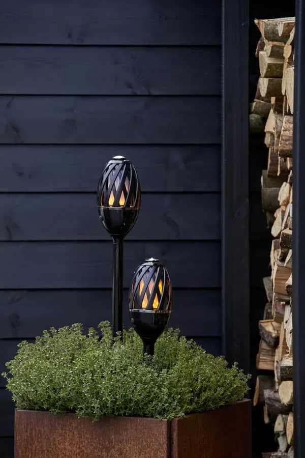 Der medfølger spyd og bordfod til faklen, så du kan placere forskellige steder i haven og på terrassen.