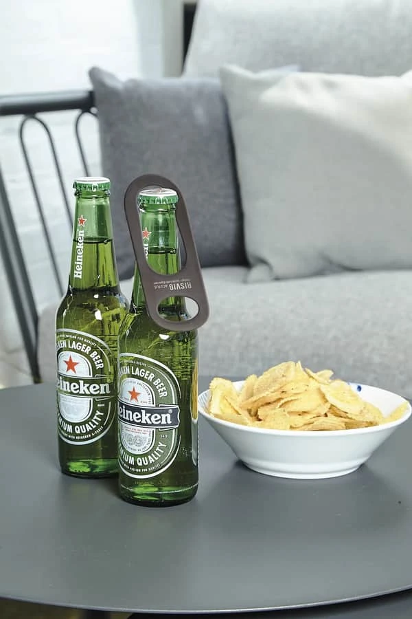 Det større hul i oplukkeren fungerer som en slags krog, der gør det nemt at hænge oplukkeren på en flaskehals. På den måde er den altid lige ved hånden og klar til brug.