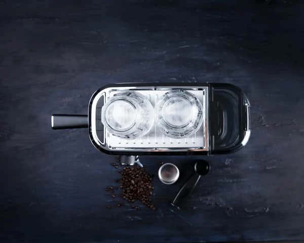 Espressomaskinen er manuelt betjent, og der medfølger to portafiltre, så du kan brygge 1-2 kopper ad gangen.