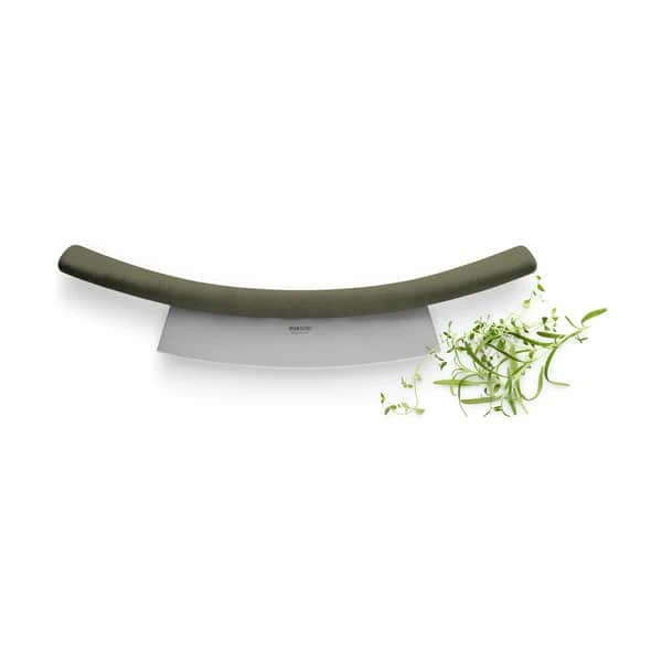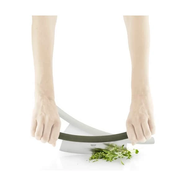 Gør det sjovt at hakke de forskellige krydderurter til retten, med en vuggekniv fra Eva Solo. Kniven har en halvmåne form, der gør hakning af grønsager lige til. Du skal blot vugge med lette bevægelser, frem og tilbage hen over krydderurterne eller grøntsagerne med knivens buede skær. Knivens udformning sikrer dig et godt og stabilt greb i begge ender.