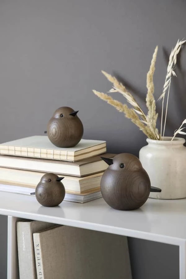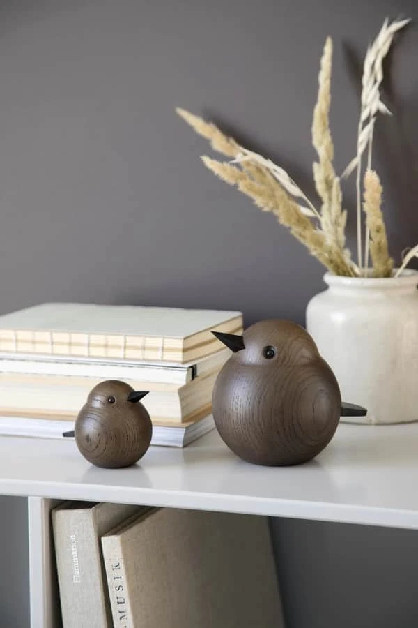 Spurvene tager sig godt hver for sig, men har det selvfølgelig bedst, når de er tæt på hinanden. Spurvefamilien er håndlavet i massivt røgbejdset egetræ af dygtige trædrejere.