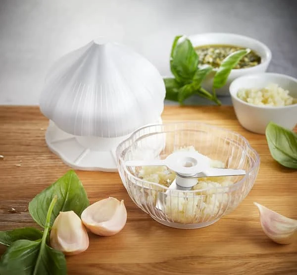 Hvidløsgskæren er designet som et hvidløg, hvilket gør den ekstra sjov at arbejde med i køkkenet. Den skridsikre base sørger for at den står solidt på bordet og er nem at arbejde med.