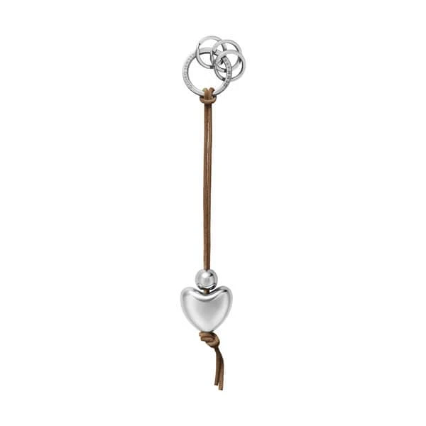 Nøgleringen fra Georg Jensen er udsmykket med et krombelagt hjerte og en lille rund kugle, der er monteret på en rem af naturligt kalveskindslæder. Det giver en lækker, moderne og sanselig nøglering, der også sagtens kan bruges som håndtaskecharm.