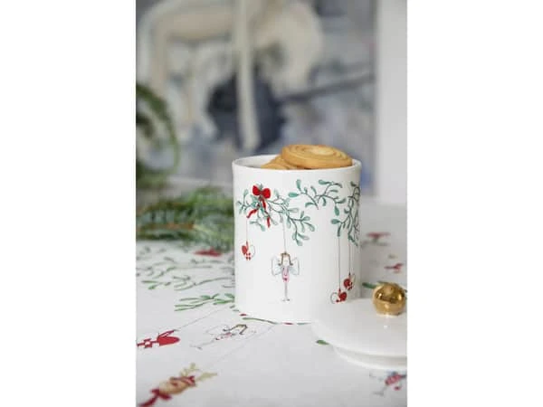 Julens godter serveres flot i stellet fra Medusa Copenhagen. Den lille krukke er dekoreret med dejlige tegninger af mistelten og julepynt, og toppen er gylden.