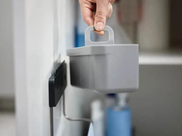 Gem svampe, opvaskebørster og -middel væk med denne smarte opbevaringsløsning fra Joseph Joseph, der kan gemmes væk i skabet ved brug af det medfølgende beslag. Opbevaringskassen kan let tages af beslaget og løftes op til vasken i håndtaget, når du skal bruge indholdet.