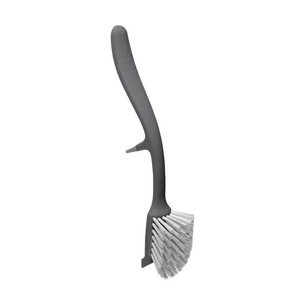 Designet af opvaskebørsten fra Joseph Joseph har et skridsikkert holdepunkt, der gør det muligt at opbevare den på indersiden af vasken og derved spare plads og lade overskydende vand og sæbe dryppe væk. Det ikke-ridsende børstehoved er buet for at hjælpe med at rengøre i hjørnerne på bakker og pander og har en integreret pandeskraber til madrester, der sidder godt fast.