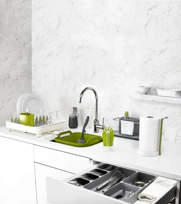 Hold hygiejnen høj i køkkenet med den smarte opvaskebørste fra Joseph Joseph, der kan hænge på kanten af vasken, så vand og sæbe nemt kan dryppe af.