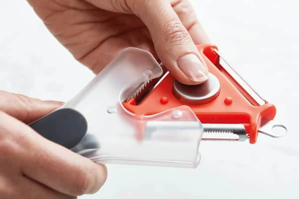 Med Tri-Peeler fra Joseph Joseph får du tre skrællere i ét smart design. Skrælleren har tre klinger af rustfrit stål – en lige klinge, et julienne-jern og en klinge til blød frugt – på hver deres side af en trekant. Du kan nemt skifte mellem de forskellige klinger ved at trykke på den store knap, hvorefter du kan fjerne og rotere den trekantede hovedenhed.