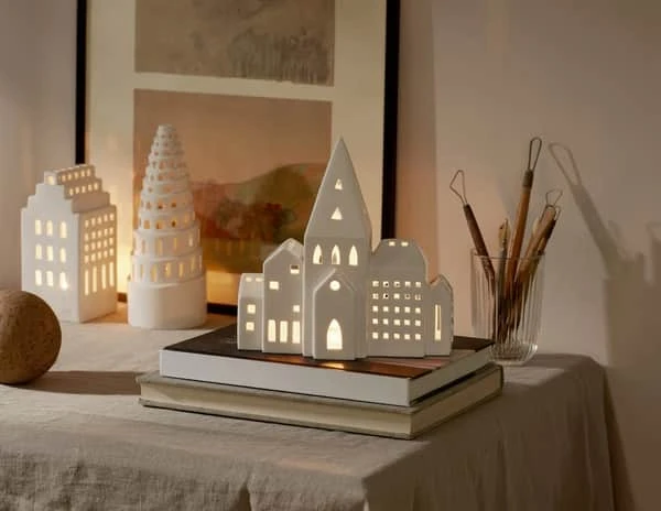 Lyshusene fra Kähler er produceret i keramik og er en moderne fortolkning af byrummet med et elegant og eksklusivt udtryk. Klassisk keramik og nordisk design spiller godt sammen i disse lyshuse.