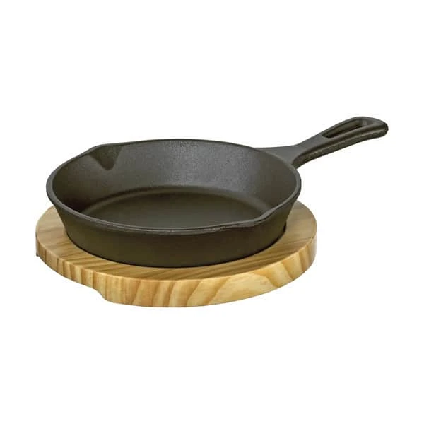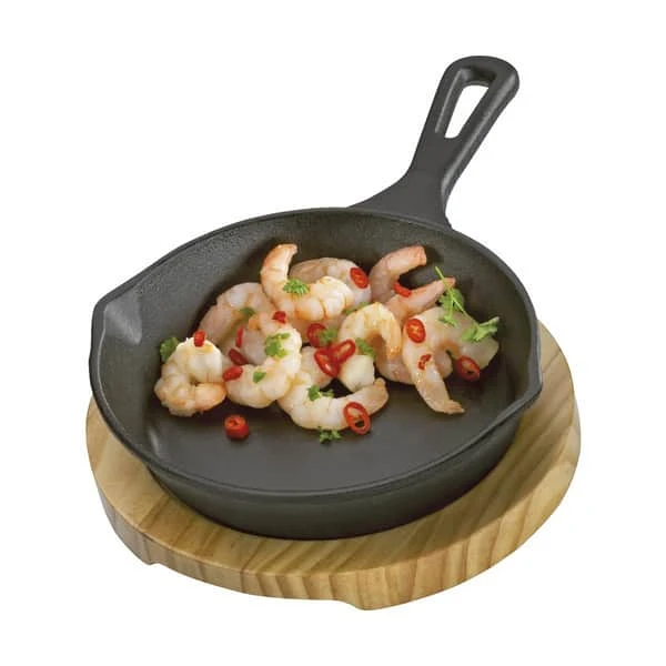 Brug støbejernspanden som et alternativ til engangsbakker af aluminium. Panden kan også bruges på komfuret og i ovnen. Panden kommer med et bræt af fyrretræ, som er ideelt til servering. En fordybning i brættet holder panden på plads, så du ikke skal tænke på om den glider af brættet. Støbejernspanden og brættet måler 26 x 18 x 6 cm.