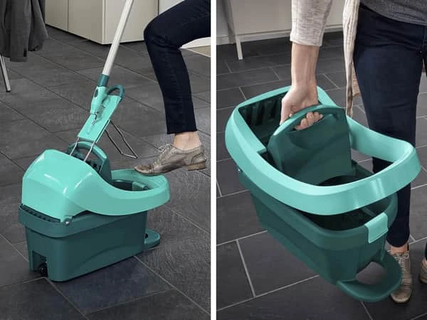 Profi XL Mobile gulvspanden fra Leifheit er udstyret med et robust håndtag, hjul og et fodbetjent vridesystem. Med dette vridesystem bliver gulvvasken hurtigere og samtidig mere skånsom for hænder og ryg. Du behøver nemlig ikke at få våde hænder eller bukke dig ned – du løsner bare mikrofiberkluden fra holderen med et hurtigt tryk med foden, dypper kluden i spanden, og placerer den i vrideren, som du ligeledes kan betjene med foden, og dernæst klikker du den bare på plads i holderen på gulvspanden. Lige så effektivt, som hvis du vred kluden med hænderne. Spanden har to let rullende hjul og skubbes nemt omkring, og kan med fordel bruges sammen med Profi XL Mobile Micro Duo gulvvaskeren fra Leifheit.