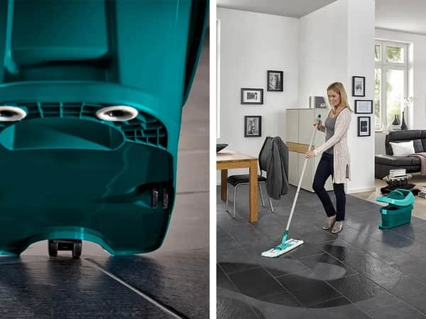 Med det fleksible 360° drejeled kan du effektivt føre gulvvaskeren rundt i bløde sving og komme ubesværet omkring bord- og skabsben og under møbler og senge. Dobbeltfiber-kluden når de mindste fordybninger og fjerner selv genstridigt snavs grundigt. Spanden har to let rullende hjul og skubbes nemt omkring.