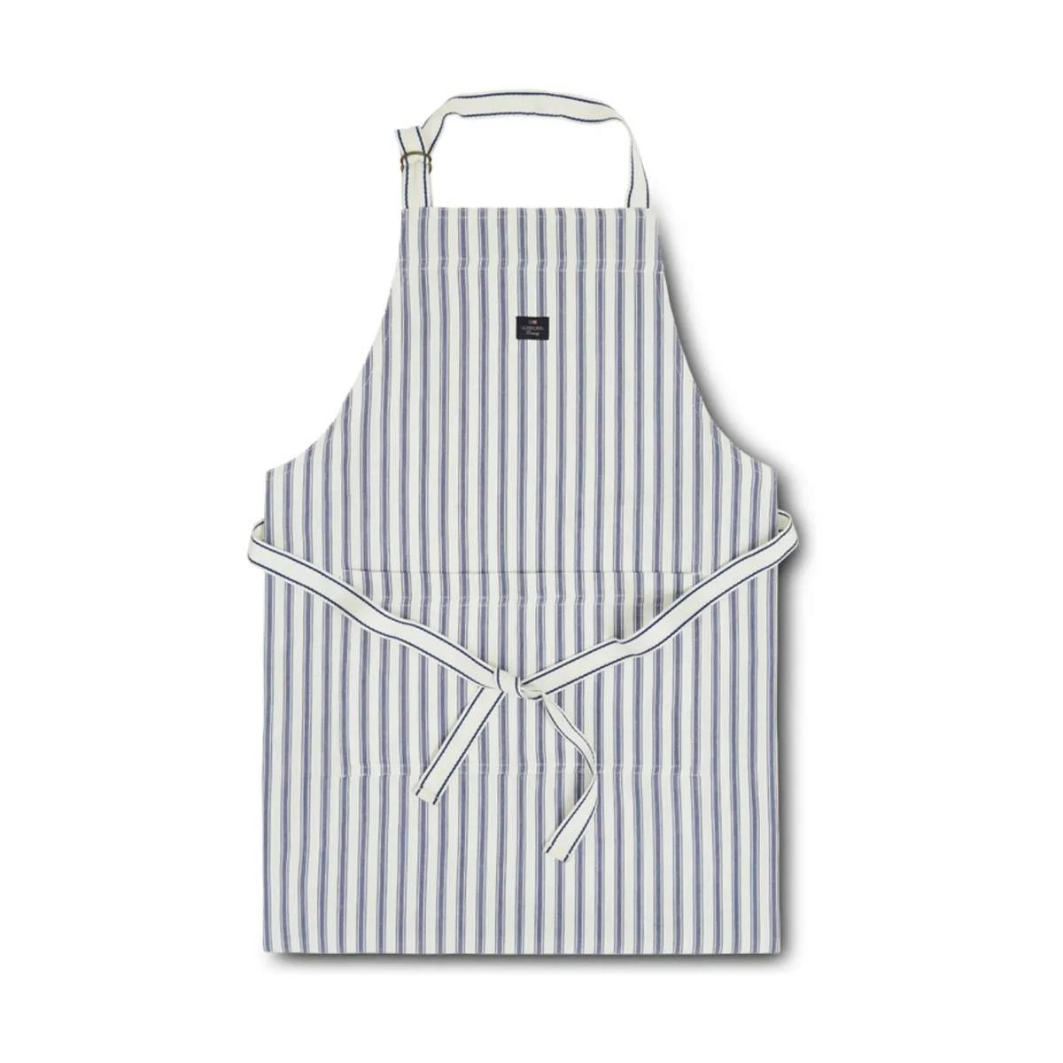 Dette forklæde i et flot stribet design er i bomuld med sildebensvævning. Forklædet i sildebensbomuld har flotte stropper i matchende farve og er udsmykket med brandmærket i mørkeblåt.