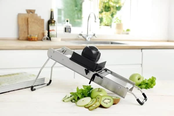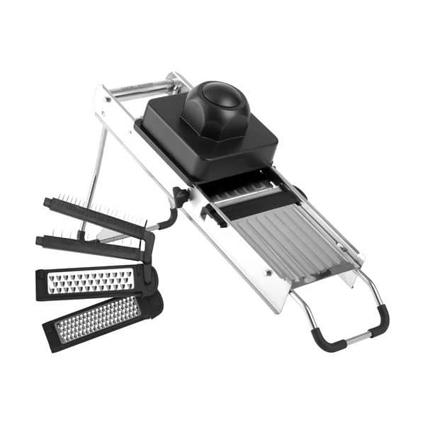 Praktisk Cook & Baker mandolinjern i en god kvalitet til en fornuftig pris. Det har 5 skær, der river, snitter og strimler alle slags grøntsager og frugt. Det kan justeres til at skære fint eller groft.