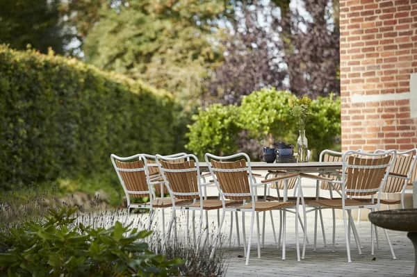 Indret dig på terrassen eller i haven med det kendte havemøbel-design Marguerit fra Mandalay. Sættet består af et Marguerit bord og 8 stole.