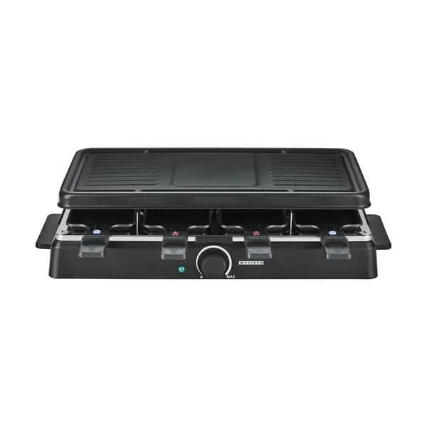 Racletten har plads til 8 personer med sin store grillplade øverst, og 8 mindre pander nederst. Tilbered kød, pølser og skaldyr på grillpladen og lad gæsterne selv vælge, hvad der skal på raclettens mindre pander – friske grøntsager, æg eller ost – kun fantasien sætter grænser.