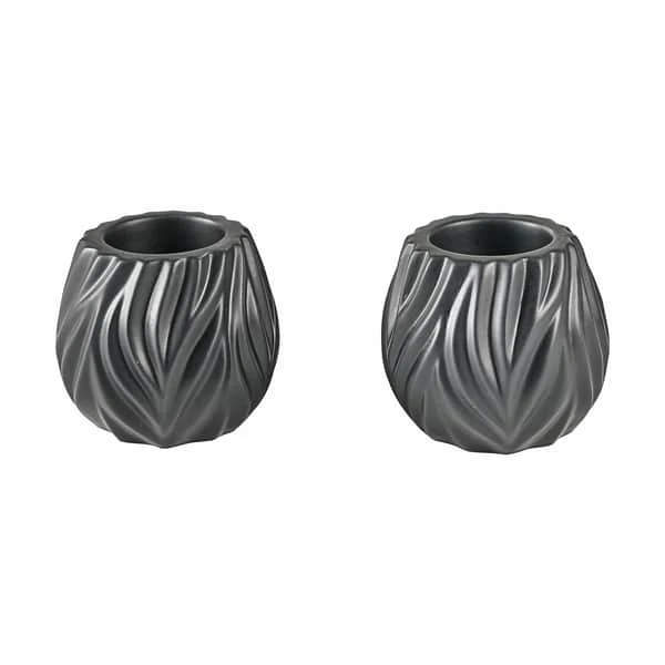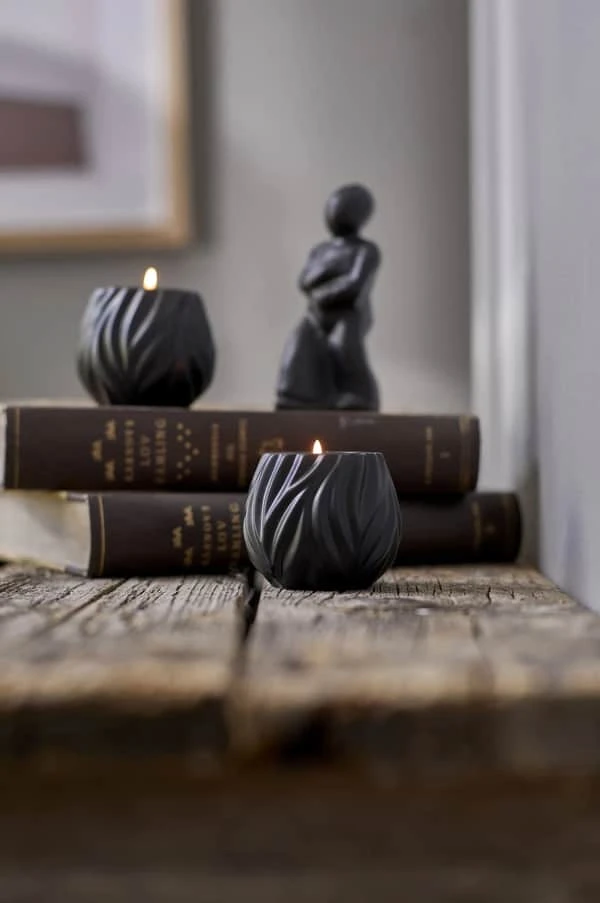 Samspillet mellem de bølgende fordybninger og stagernes organiske form giver dem en unik karakter. En sort glasering tæmmer fyrfadsstagernes udtryk – stil dem sammen med Flame vasen og fuldend looket i din indretning.