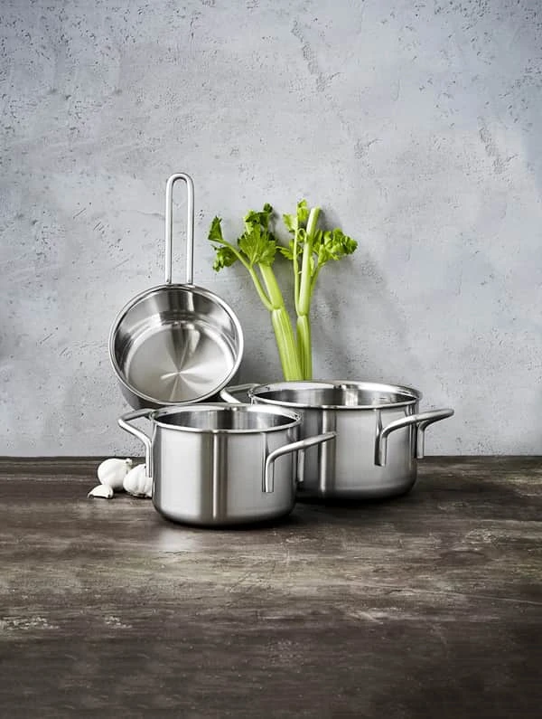 Multi serien fra Eva Trio består af forskellige gryder og pander, der er designet med en 3-lags konstruktion, der består af rustfrit stål og med en kerne af aluminium. Det giver en utrolig god varmefordeling.