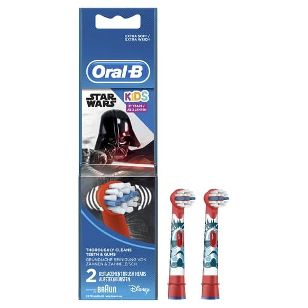 Med Oral-B Kids Star Wars 2 tandbørstehoveder er det lidt lettere at få husets jedi til at holde tænderne sunde og rene. Tandbørstehovedet har ekstra bløde børstehår, der effektivt fjerner plak, rengør grundigt hele vejen rundt om tænderne og giver en nænsom børsteoplevelse.