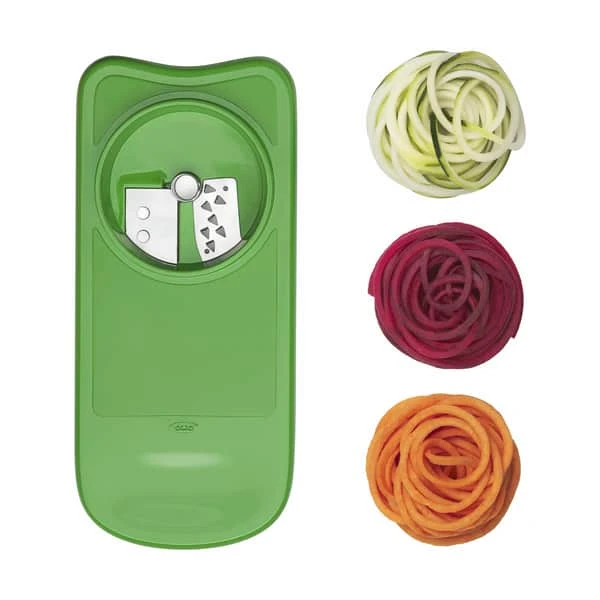 Er du træt af at have forskelligt køkkenudstyr liggende i ét stort rod i køkkenskabet? Og ville du ønske, at det hele bare var samlet i én smart løsning? OXO Good Grips mandolinsættet samler mandolinjernet, rivejernet og spiralizeren i én samlet beholder – smart!
