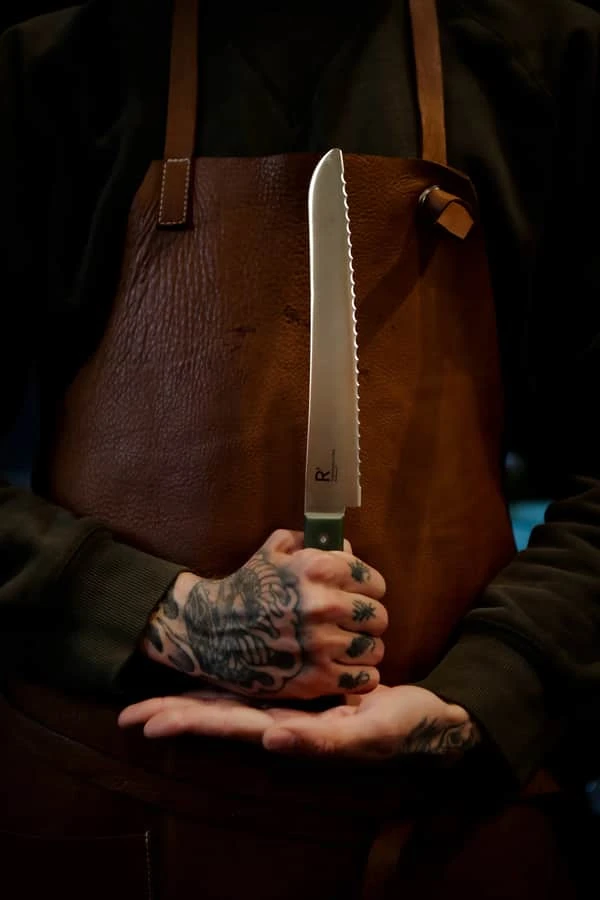 Brødkniven er fremstillet i tysk rustfrit stål og har et grønt håndtag i Polyoxymethylen (POM), som er et slidstærkt og holdbart materiale, der ikke ødelægges ved gentagen rengøring.