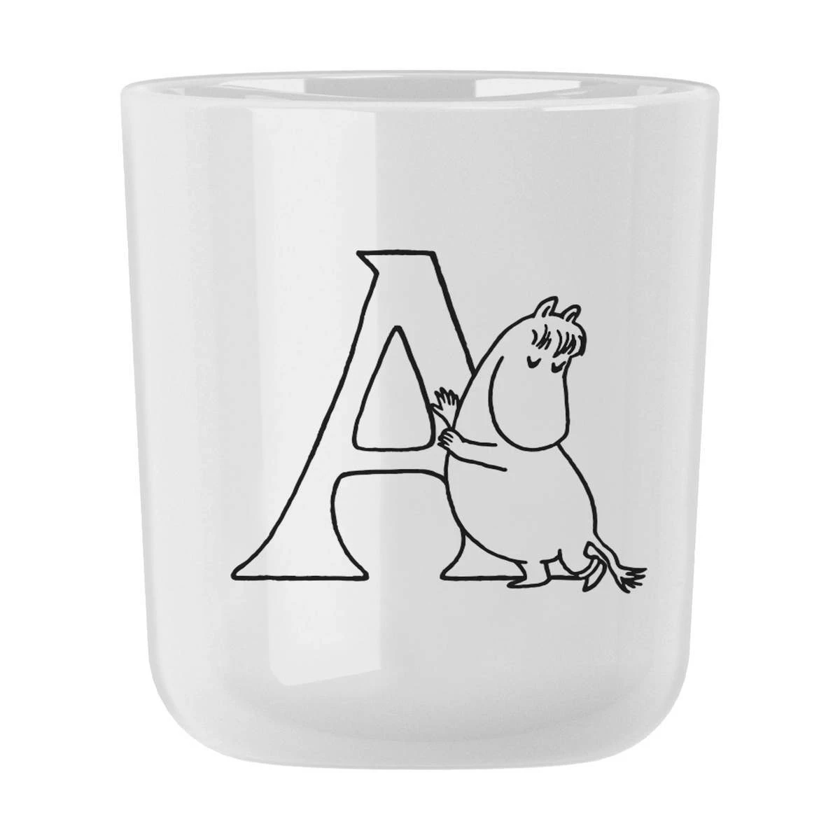 Moomin ABC koppen kommer i 26 versioner med hvert sit bogstav fra A til Z, samt en af de sjove figurer fra Mumiernes verden, afbilledet på siden af koppen.