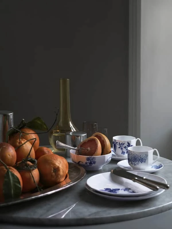 Stellet, Blomst, fra Royal Copenhagen er skabt i et møde mellem den traditionsrige kulturhistorie og et moderne designudtryk. Det klassiske blå blomstermotiv har fået lov til at gro frit på hvert element i serien. Hver tallerken, kop og underkop har sin egen enkelte påmalede blomst, som sammen skaber en dynamisk og livlig helhed, men samtidig giver hvert element sit eget individuelle look.
