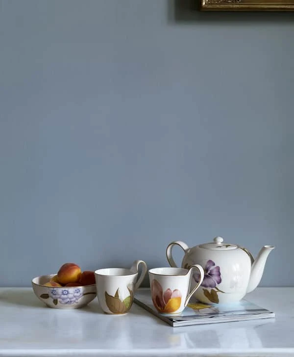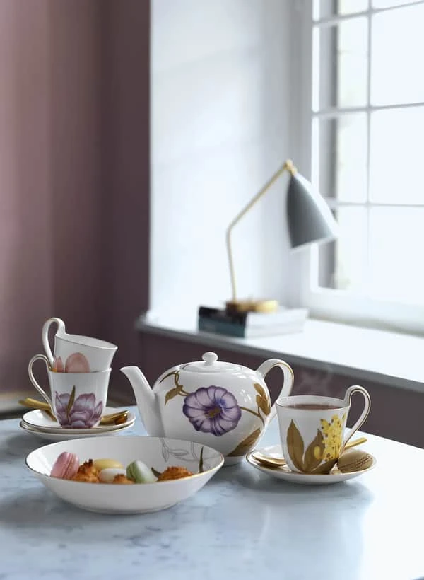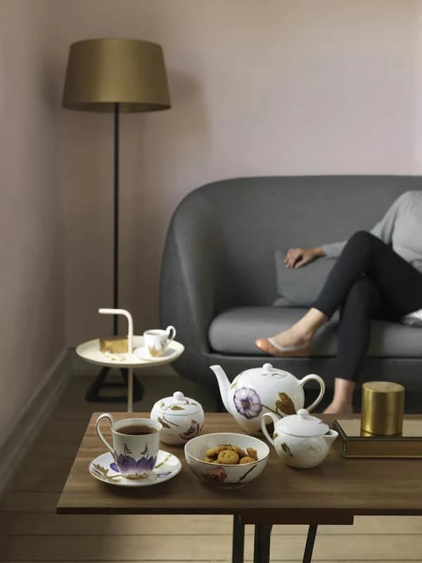 Inviter veninderne til en hyggelig stund over en kop te og sæt Flora tekande fra Royal Copenhagen på bordet. Tekandens design er et elegant lærred for snerlens gyldne stængel, og de lilla kronblade nærmest blomstrer ud af benporcelænet.