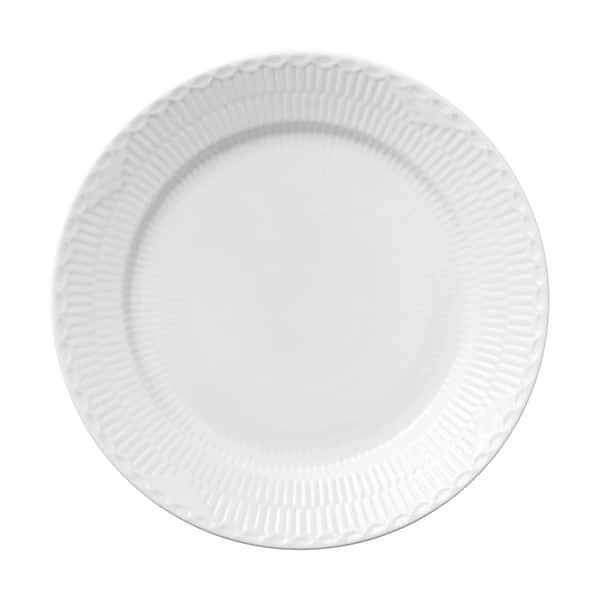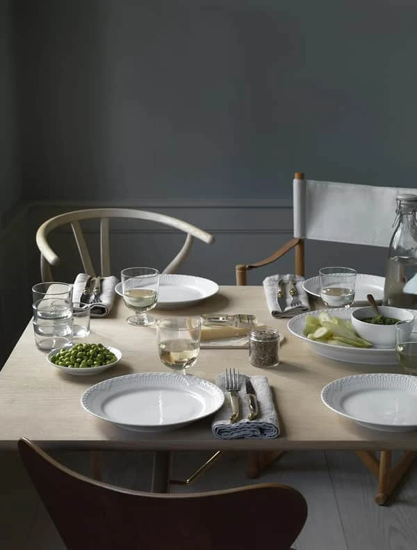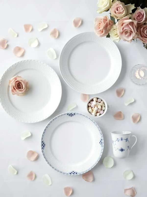 Middagsbordet får et yndefuldt præg, når det er dækket med Hvid Halvblonde middagstallerkenen fra Royal Copenhagen.