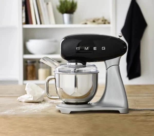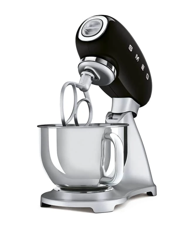 Retro køkkenmaskine i formpresset aluminium fra SMEG i en enkel sort farve. Med denne køkkenmaskine er du dækket ind i forhold til de udfordringer, du møder i køkkenet i hverdagen eller når der skal eksperimenteres med lækre opskrifter til weekendens gæster.