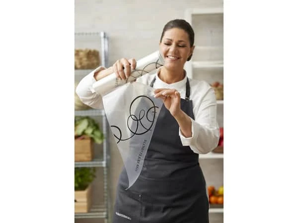 Brug engangsprøjteposerne fra Mette Blomsterberg når du skal lave fyldte chokolader, pynte kager eller lave varme retter i det salte køkken. Poserne passer til Blomsterbergs tyller. Poserne er 47 cm lange og rummer ca. 3,5 liter. Fremstillet i kraftigt, fødevaregodkendt plastik.
