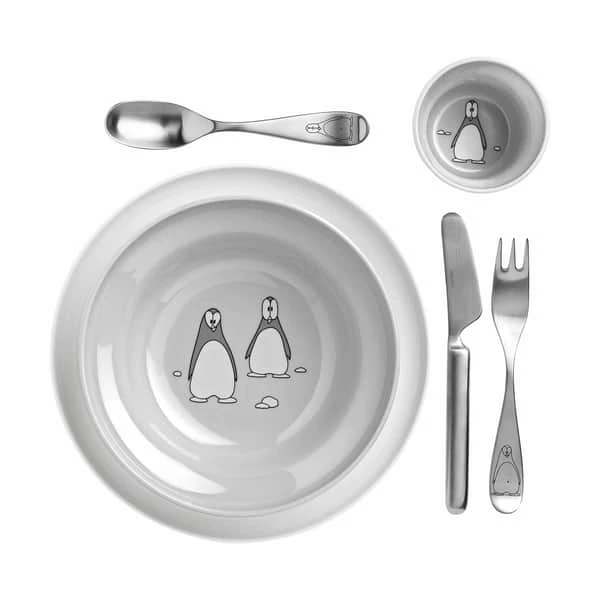 Pingo Børneservice fra Stelton består af tre dele – en tallerken, en skål og en kop. Når broccolien er spist, havregrynene er røget indenbords, og minimælken er skyllet ned, gemmer der sig pingviner i bunden af både tallerken, skål og kop. Så er det altså bare lidt sjovere at spise op!