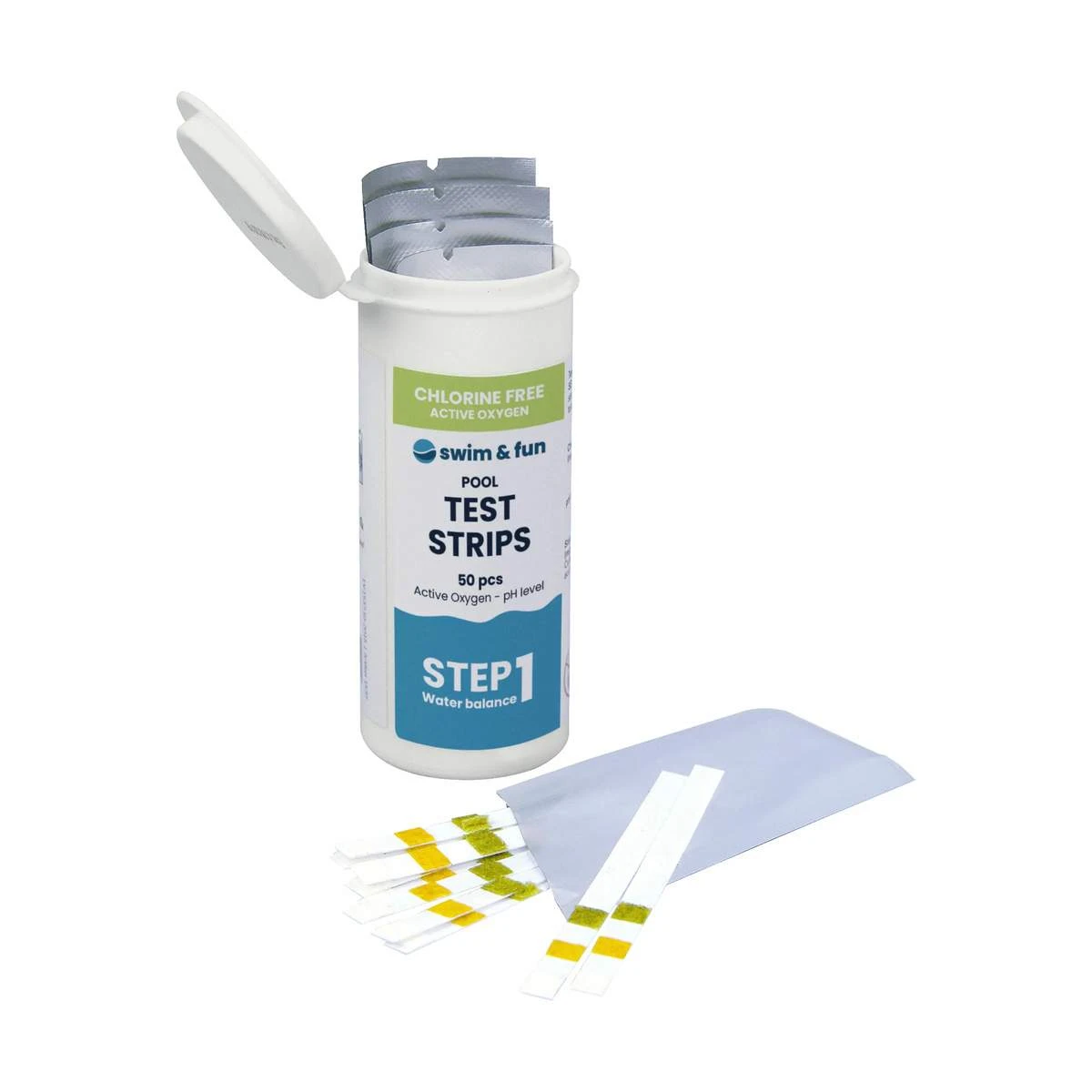 Test din pool for mængden af aktiv ilt og dens pH-værdi. På den måde ved du hvad din pool mangler. Stripsen kan nemt aflæses ved hjælp af farveskalaen på Swim & Fun test strips beholderen.