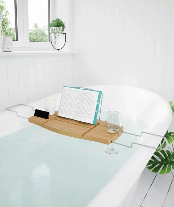 Skab den helt perfekte selvforkælelsesdag med en Aquala badeholder fra Umbra. Holderen er lavet af bambus med plads til den gode bog, sæben, telefonen og hvis det skal være ekstra hyggeligt – det gode glas vin. Badeholderen kan udtrækkes, så den kan nå over de fleste badekar.